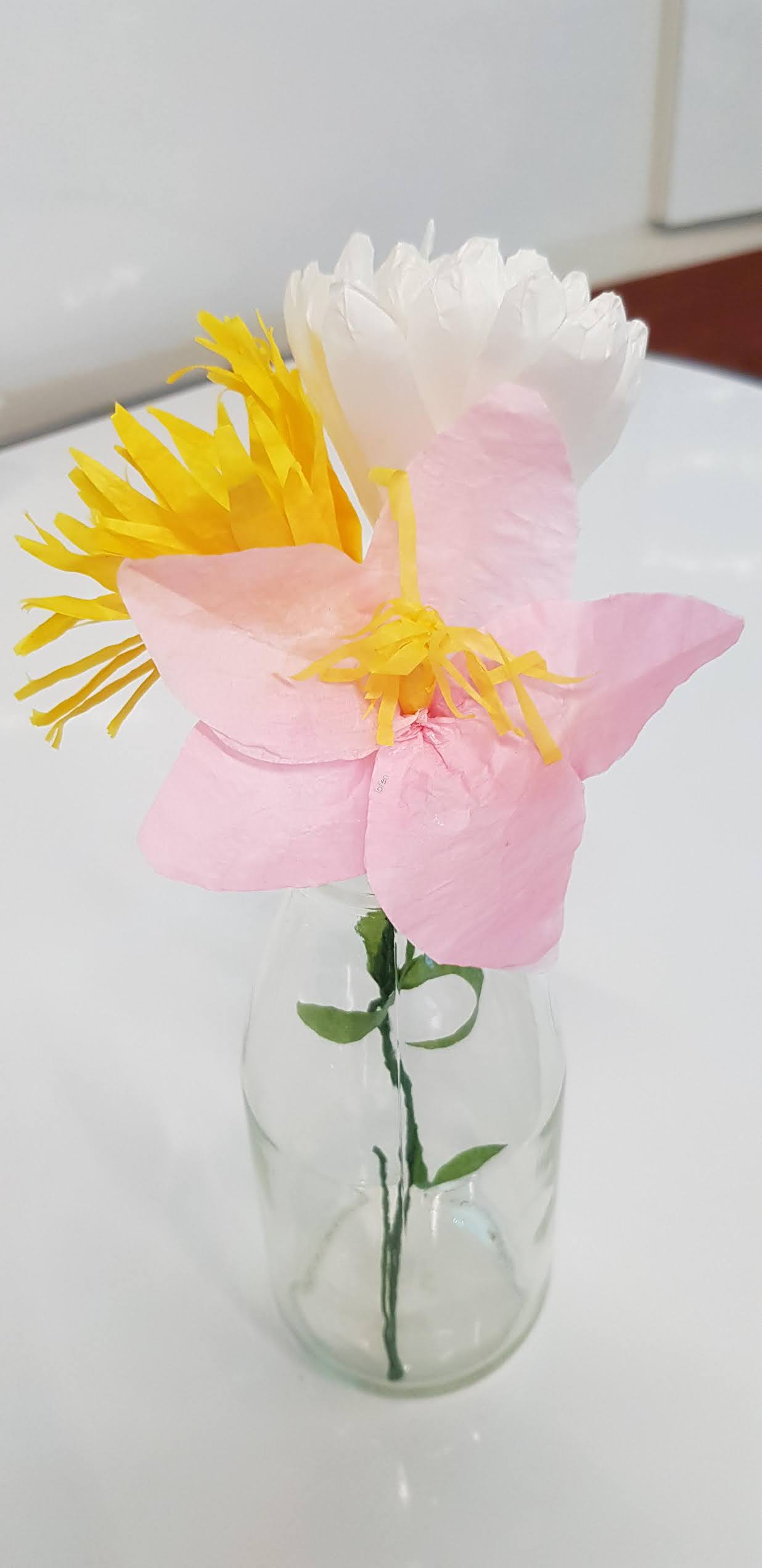這一天,我們讀黃遵憲的詩《以蓮菊桃雜供一瓶作歌》,談他任職新加坡總領事時,注意到本地種族和諧的現象。第一組同學用色紙製作了白蓮、黃菊和紅桃花,讓大家直觀花與詩意。第二組同學用黃遵憲的詩句,唱起鄧麗君的"我只在乎你",打起節拍把排比的部分唸成rap,活潑生動展現文學的"歌行體"!